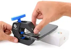 Потяните синюю рукоятку назад, чтобы разблокировать рычаги, и снимите Anti‑Clamp, потянув за язычки на присосках.