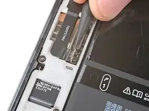 Используйте наконечник лопатки, чтобы аккуратно приподнять пластиковую прокладку, которая проходит вдоль верхней части крышки порта USB‑C.