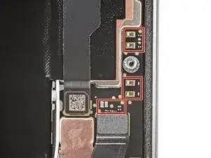 Чтобы не повредить компоненты поверхностного монтажа вокруг аккумулятора и разъёмов 5G миллиметрового диапазона, поддёргивайте только в указанных местах.
