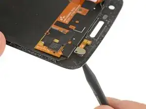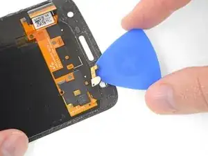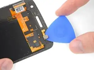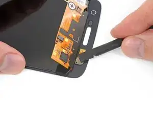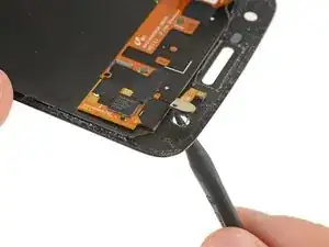 Используйте острие лопатки, чтобы надавить на внешнюю сторону модуля вспышки, пока он не отделится от сборки дисплея.