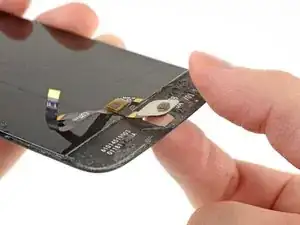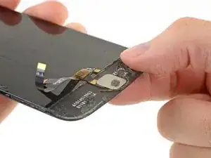 Разместите новую сборку дисплея лицевой стороной вниз и аккуратно опустите датчик отпечатка в положение на тыльной стороне.