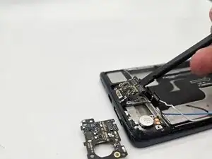Используйте крестовую отвертку Phillips #00, чтобы выкрутить два серебристых винта длиной 1,5 мм, удерживающих дочернюю плату и разъём для зарядки.