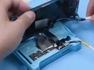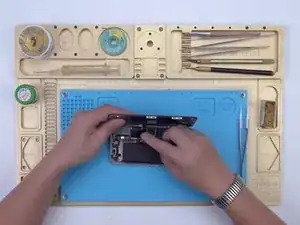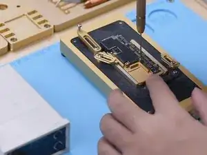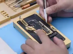 Закрепите сигнальную плату и плату логики в тестовом приспособлении. Подключите экран к материнской плате через удлинительный тестовый кабель. Подключите шлейф зарядного порта и силовой кабель. Затем включите телефон, подключив его к компьютеру.