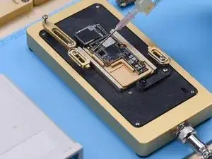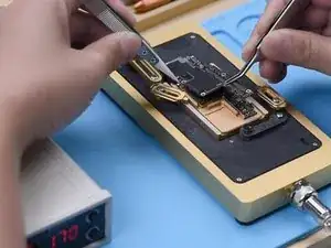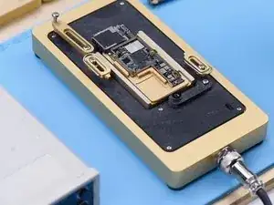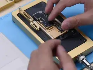Поместите сигнальную плату на нагревательную платформу. Установите температуру на 180℃ для прогрева. После формирования паяльных шариков отключите питание и охладите сигнальную плату. Нанесите немного флюса. Выровняйте плату логики с сигнальной платой. Продолжайте прогревать материнскую плату при 180℃.