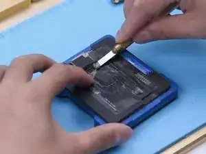 Удалите термопасту с платы логики и сигнальной платы. Закрепите сигнальную плату в держателе. Смочите флюсом припой паяльником при 365℃ и используйте оплетку для удаления олова с контактных площадок. Аналогичным методом удалите олово с платы логики.