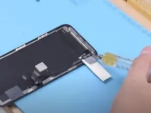 Снимите слушалку и гибкий кабель датчиков с оригинального экрана. Затем подложите кусочек бумаги под сенсорный шлейф. Разогрейте феном горячего воздуха и подденьте сенсорный модуль на оригинальном экране.
