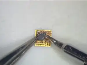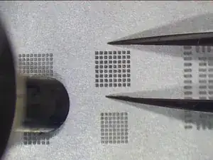 Концентрированный нагрев может деформировать трафарет. Это также повлияет на формирование шариков припоя. По завершении охладите в течение 1 минуты. Очистите очистителем для печатных плат. Осторожно отделите чип от трафарета пинцетом. Затем зажмите чип пинцетом.