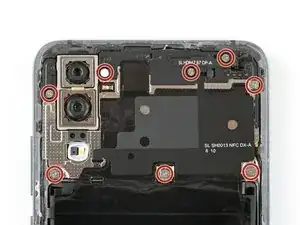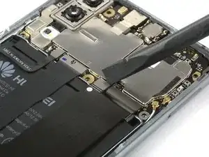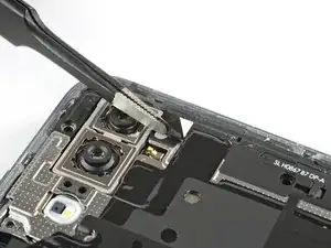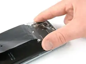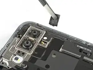 Используйте пинцет, чтобы отодрать черную ленту рядом с задней камерой с крышки материнской платы.