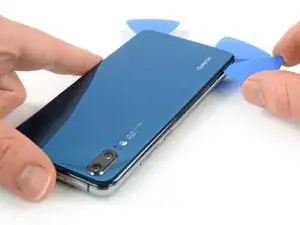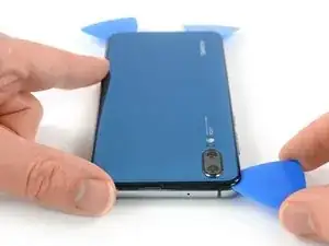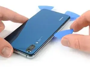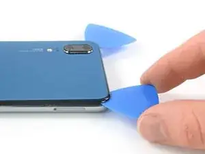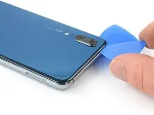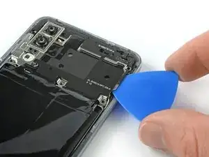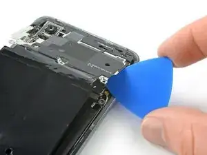 На следующих шагах при разрезании клея вокруг кнопки питания и задней камеры используйте только кончик медиатора, чтобы не перерезать кабель, не запачкать линзу и не повредить камеру.