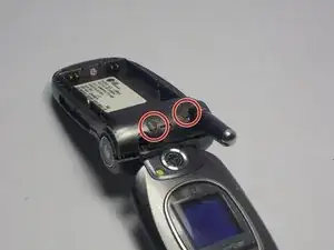 Найдите два резиновых подкладки, закрывающих винты в верхней части телефона у петли.