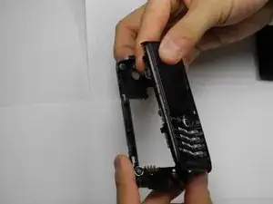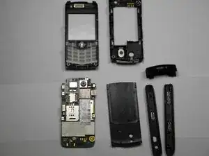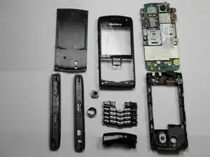 Это все части BlackBerry Pearl 8100 полностью разобранного устройства. Слева направо части следующие: задняя крышка, передняя панель, материнская плата, боковые крышки, трекбол, клавиатура, нижняя крышка и рама.