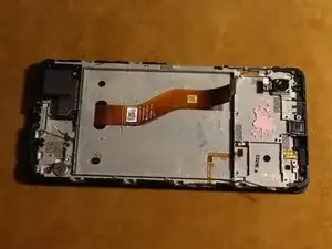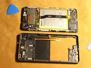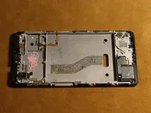 Используйте медиатор, чтобы отщёлкнуть рамку от части, где расположены экран, платы и аккумулятор. Медиатор легко проходит рядом с лотком SIM-карты. Проведите им по краям, пока рамка не отщёлкнется повсюду. Рамка соединена с основной платой ленточным кабелем. Отключите его и снимите рамку с остальной части телефона.