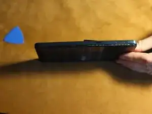 Затем используйте тонкий металлический предмет, чтобы немного приподнять экран, начиная с нижней части. После этого вы сможете вставить пластиковый медиатор под экран. Будьте осторожны, чтобы не сломать экран. Как только медиатор вставлен, и если клей был должным образом нагрет, вы сможете провести им вдоль краёв, чтобы отклеить экран. Экран затем снимется.