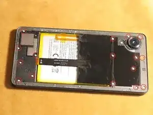 Снимите заднюю крышку: слегка нагрейте её, затем вставьте медиатор или тонкий металлический предмет и подденьте с одной стороны, после чего проведите медиаторами вдоль краёв, чтобы отклеить всю крышку. Крышка будет держаться около объектива камеры.