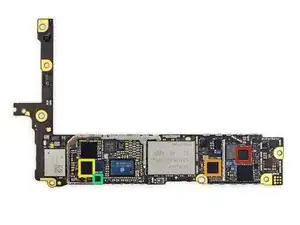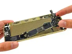 Как и в iPhone 5s, шлейфы дисплея надёжно закреплены металлической скобой на логической плате.