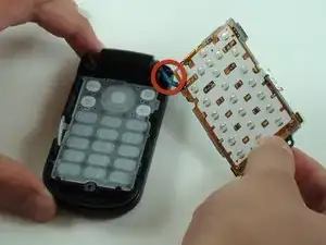Плата логики соединена с остальной частью телефона двумя проводами в верхнем правом углу, обозначенным красным кругом. Не повредите провода.