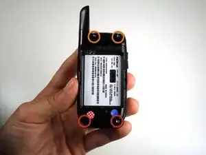 Используйте отвертку Phillips #00 или пальцы, чтобы снять резиновые заглушки в верхней задней части телефона.