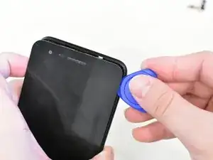 Используя медиатор для вскрытия, подденьте между стеклом экрана и рамкой.