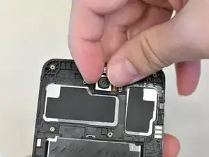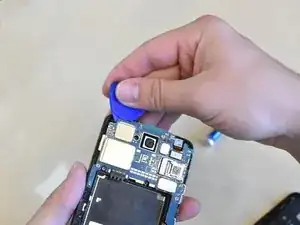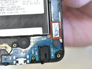 В правом нижнем углу телефона найдите кабель, фиксирующий материнскую плату в корпусе.