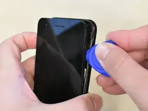 Подденьте сверху и снизу экрана медиатором (см. фото), чтобы освободить защёлки, удерживающие плату в корпусе телефона.