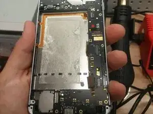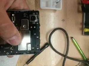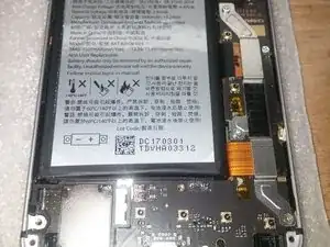 Открутите два винта с крестообразной головкой, крепящие разъём аккумулятора к материнской плате. Теперь можно вынуть аккумулятор. Аккумулятор сильно приклеен. Рекомендуется нагреть и использовать пластиковый инструмент, чтобы постепенно извлечь аккумулятор. Шлейфы питания и кнопок громкости проходят под аккумулятором. Будьте осторожны в верхнем левом углу.