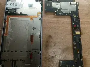 После удаления всех винтов и кронштейнов и отключения всех гибких кабелей вы можете вынуть материнскую плату. Рекомендуется начинать с верхней части (со стороны тыльной камеры) и снимать плату сверху вниз, поскольку порт зарядки зафиксирован в рамке телефона и удобнее извлекается последним.