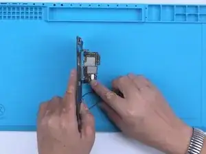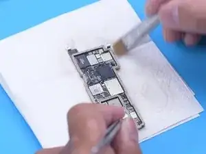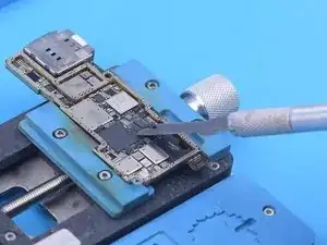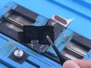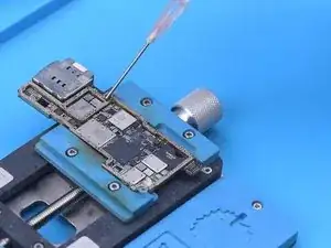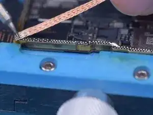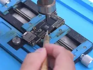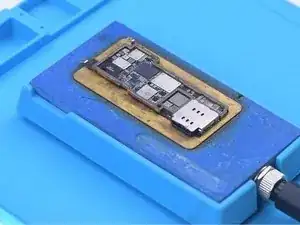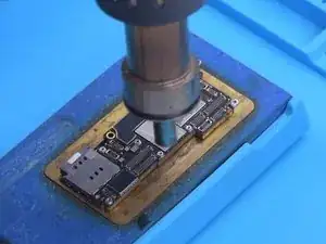 Нанесите немного флюса на контактные площадки. Выровняйте логическую плату с платой сигнала. Продолжайте нагревать на нагревательной платформе при 170 °C. Добавьте нагрев вокруг материнской платы горячим феном при 330 °C.