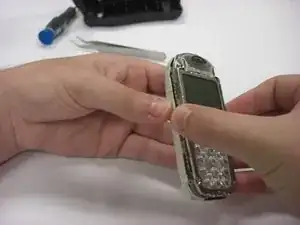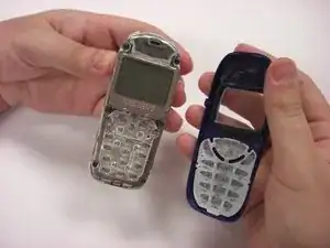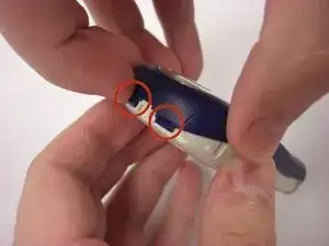 Крепко возьмите белый корпус телефона одной рукой и синюю крышку другой рукой, как показано на первой фотографии.