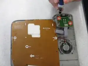 Выкрутите два винта (размер головки: 4 мм, длина: 8,6 мм) на нижней крышке, чтобы снять динамик, освободив фиксирующий штифт.