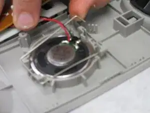 Освободите динамик из фиксирующего штифта, надавив вниз на каждый конец штифта и отведя его в сторону от динамика.