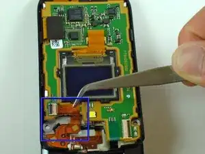 Удалите показанный гибкий шлейф с помощью пинцета (или используйте пальцы при надёжном захвате).