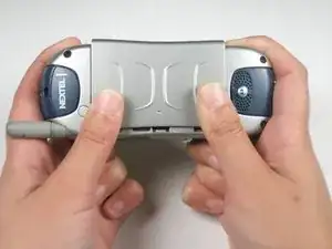 Нажмите большим пальцем на верхнюю часть задней крышки, как показано, и потяните вниз, сдвигая крышку с корпуса.