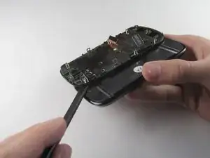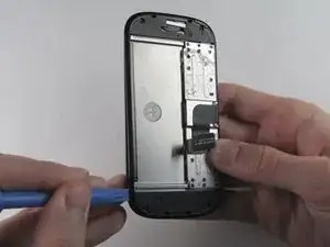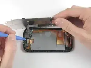 Проведите пластиковым инструментом вдоль краёв, чтобы отделить чёрную пластиковую крышку от блока дисплея.