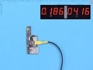 Далее проверяем ток, запитывая плату постоянным источником питания. На плате зафиксирована утечка тока 186 мА.