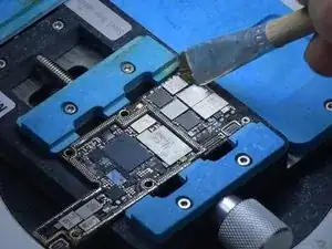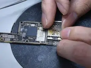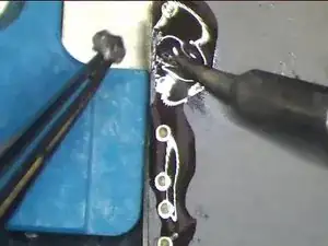 Далее используйте спиральный горячий воздух с температурой 340 °C, чтобы прогреть разъём для карты. Пытайтесь поддеть разъём лопаткой, пока прогреваете. Когда разъём ослабнет, снимите его.