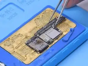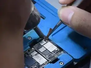 Нанесите немного пасты-флюса. Снимите GSM вертикальным горячим воздухом при 340 °C. Нанесите немного пасты-флюса и паяльную пасту средней температуры на контакты. Это снизит температуру контактов.