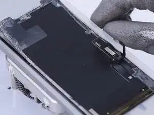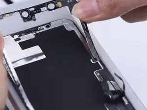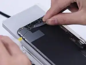 Сначала снимите гибкий кабель динамика. Так как гибкий кабель динамика очень легко повредить, учтите, что перед его снятием необходимо прогреть экран.