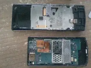 Верхняя и нижняя части телефона все еще соединены двумя шлейфами с каждой стороны. Используйте тонкий пластиковый предмет, например, кредитную карту, чтобы осторожно отключить их.