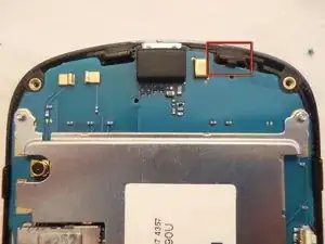 Теперь приступаем к снятию платы. Сначала возьмите зажатую часть, выделенную красным, и потяните её в сторону нижней части телефона. При этом поднимайте плату вверх.