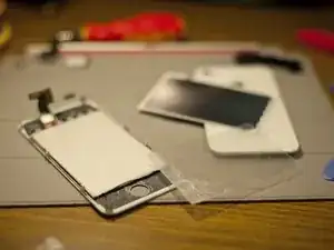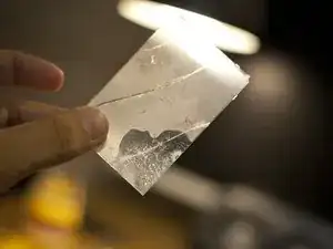 Если стекло треснуло (а чаще всего оно треснуто при замене), при снятии панель может выгнуться и отлететь мелкие осколки стекла. Перед выполнением этого шага наклейте на переднюю часть прозрачную ленту, а сам демонтаж выполняйте над мусорным ведром. Рекомендуется также использовать защитные очки.