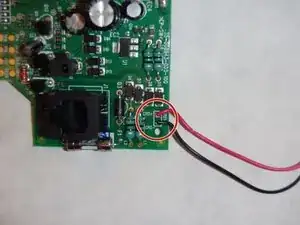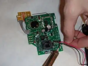 Нагрейте паяное соединение на плате, где подключены провода зарядки. Примечание: это клеммы CRD- и CRD+.