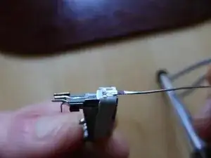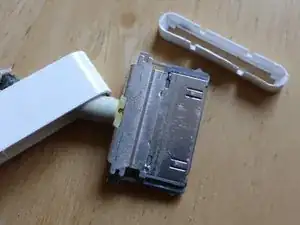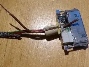 Держа оба паяных контакта разогретыми, аккуратно вставьте лезвие плоского ножа между экранирующей пластиной и разъёмом, не повредив при этом проводов снизу, пока пластина не освободится.