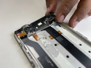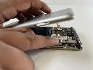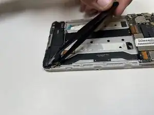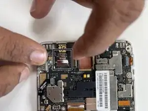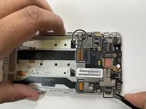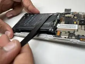 Снимите пластиковый разъём, соединяющий батарею с платой, аккуратно поддев концы разъёма с каждой стороны телефона