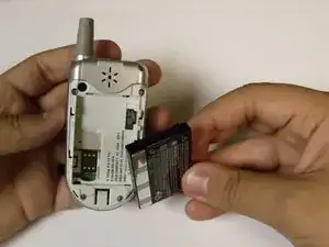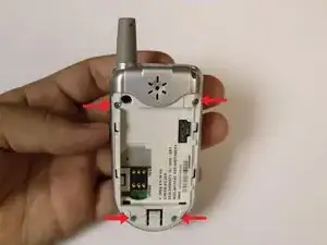 Держите кнопку нажатой, сдвиньте заднюю крышку. Это должно открыть доступ к батарее.