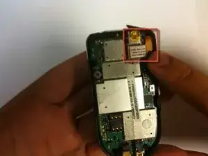 Отсоедините эту полоску, потянув за неё от материнской платы, но не от самого телефона. Это позволит вам снять материнскую плату.