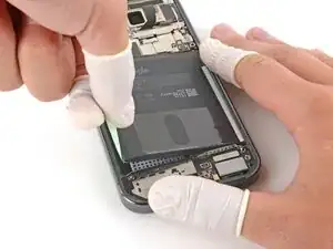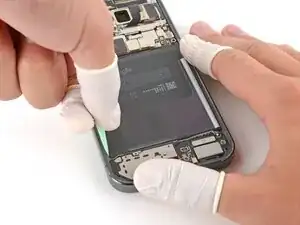 Наденьте защитные напальчники, чтобы лучше ухватиться за вытягивающие язычки аккумулятора и рамку на следующем шаге.