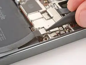 Используйте острый край лопатки, чтобы приподнять и отсоединить пресс‑разъёмы батареи и заднего стекла (press connectors).