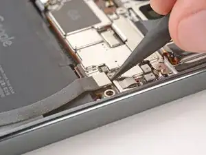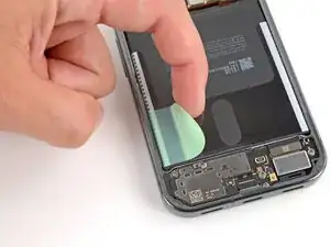 Используя пальцы, отогните всю ленту аккумулятора с левой стороны, включая тонкую полоску вдоль боковой стороны.