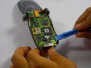 Плотно удерживая шасси одной рукой, подденьте разъём зарядки краем инструмента для вскрытия, чтобы отделить плату от передней части корпуса.