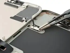 Используйте пинцет, чтобы схватить крышку разъёма переднего датчика рядом с отверстием для винта.